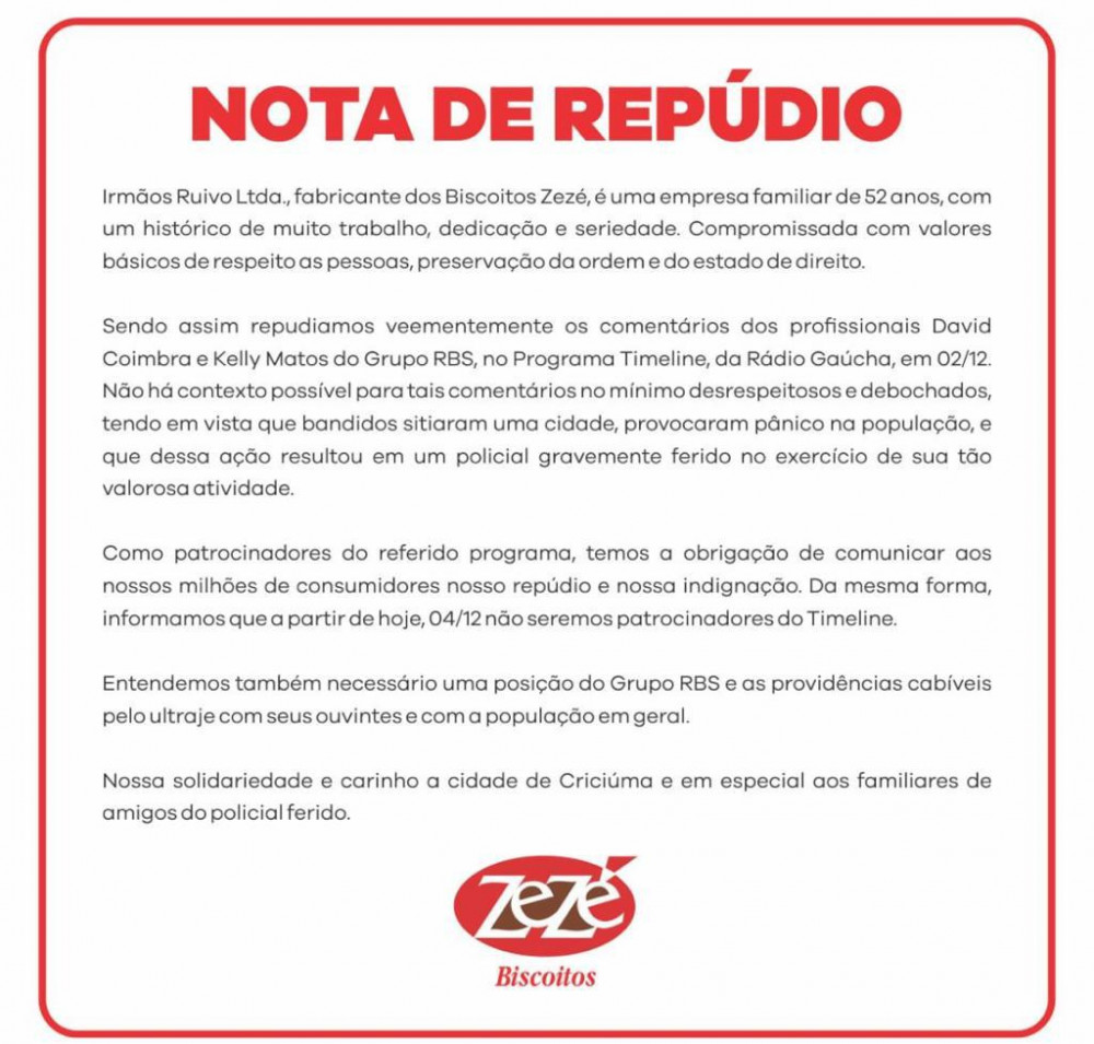 A propósito, ao encerrar este editorial recebo a notícia de que mais duas empresas, -Biscoitos Zezé- e -Cooperativa Santa Clara- também rescindiram seus contratos de publicidade com a RBS. Eis as notas que cada uma emitiu em sinal de repúdio às sustentações absurdas feitas pela Kelly Matos e pelo David Coimbra.