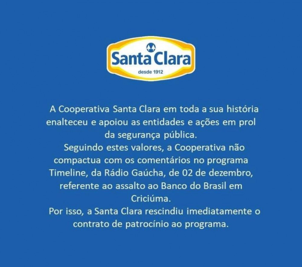 Pois, tão logo o programa chegou ao seu final, a UNICRED, que a exemplo do Banco do Brasil também é uma INSTITUIÇÃO FINANCEIRA, emitiu a seguinte NOTA: - Diante da repercussão negativa sobre o conteúdo divulgado no programa TimeLine, da Rádio Gaúcha, onde os jornalistas Kelly Matos e David Coimbra comentam os fatos do assalto a uma agência do Banco do Brasil, definimos rescindir o contrato de patrocínio, que deve cumprir o aviso prévio de 30 dias a partir da data do cancelamento.
